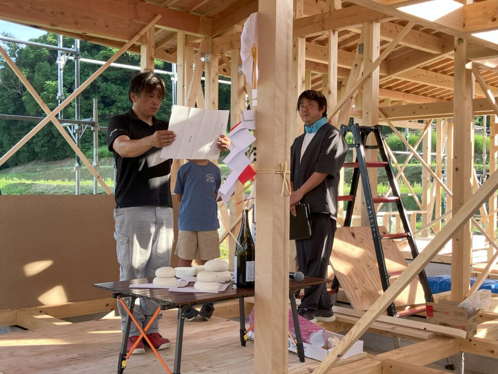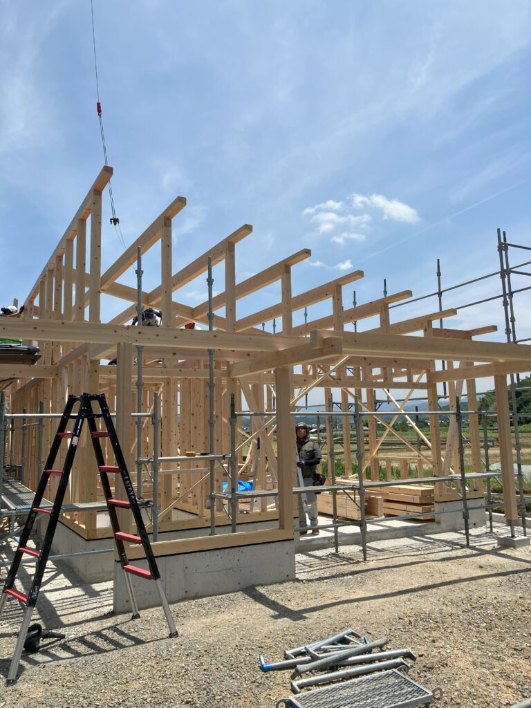 朝から柱を建てて1日かけて無事に上棟しました。
